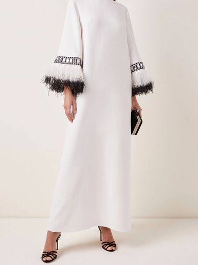 فستان أبيض أنيق مزين بأكمام من الريش الأسود الفاخر، ليمنحك إطلالة مختلفة تجمع بين البساطة الكلاسيكية والجرأة العصرية. مثالي للسهرات والمناسبات التي تبحثين فيها عن قطعة تلفت الأنظار وتبرز شخصيتك المميزة