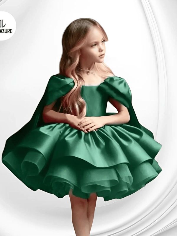فستان سهرة أطفال باللون الأخضر بتصميم منفوش أنيق من دار لازورد بجدة. خياطة احترافية وأقمشة فاخرة تمنح طفلتكِ إطلالة مميزة في المناسبات الخاصة.