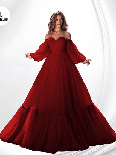 فستان سهرة أحمر منفوش بتصميم راقي مطرز بالورود الناعمة، مع أكمام أوف شولدر تمنحك إطلالة ملكية تخطف الأنظار في المناسبات الخاصة
