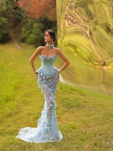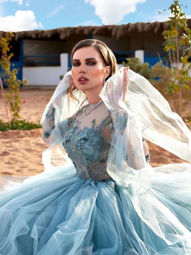 تألّقي بجاذبية خيالية مع هذا الفستان الأزرق السماوي الفاخر الذي يجمع بين الأناقة والرومانسية في كل تفصيلة. يتميز بتصميم حوري ينساب بانسيابية رائعة على القوام، مع تطريزات ثلاثية الأبعاد من الزهور والكريستال تضفي لمسة فنية راقية تلتقط الضوء بكل حركة.
