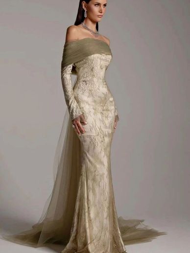 تم تصميم هذا الفستان ليُبرز جمال القوام بخطوطه الانسيابية، مع خامة الساتان المطرّز بخيوط ذهبية تمنحكِ بريقاً راقياً يليق بالملكات.