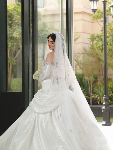 يتميز بتصميمه الكلاسيكي الفاخر بخامة الساتان الفاخرة ولمسات التول المطرز بالكريستال، ليمنحك حضوراً ساحراً وكأنكِ أميرة في يومك الكبير.
